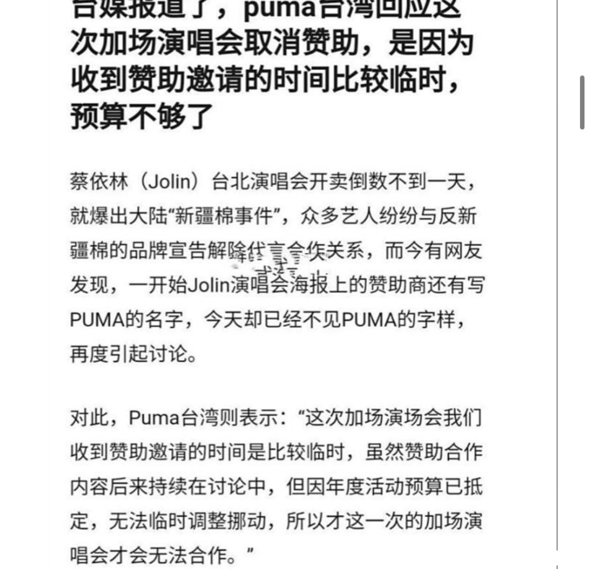 涉事品牌众多,其中包括蔡依林长期代言的PUMA。