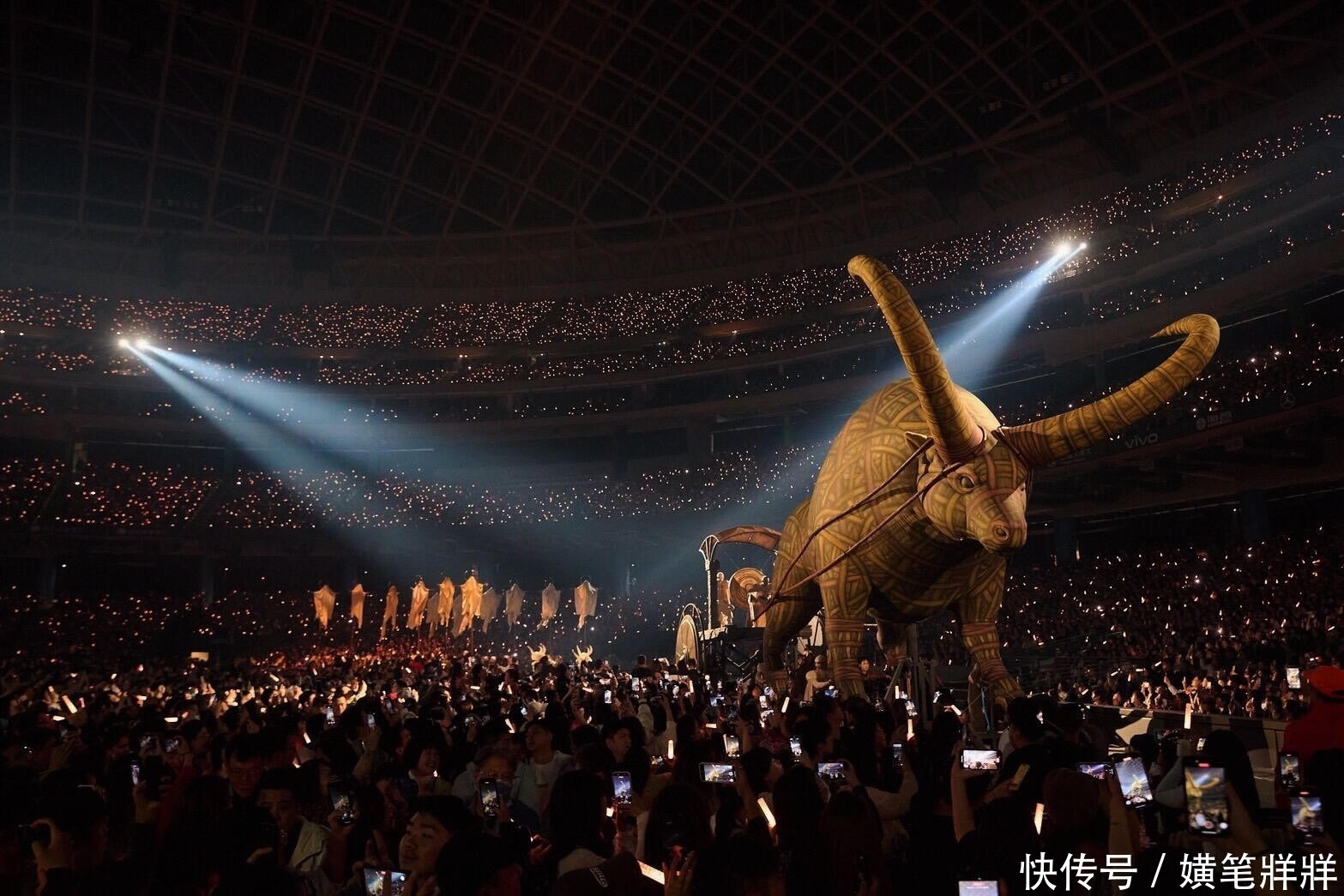 一辆高达七米、长达九米的机械公牛战车轰鸣着横扫舞台;